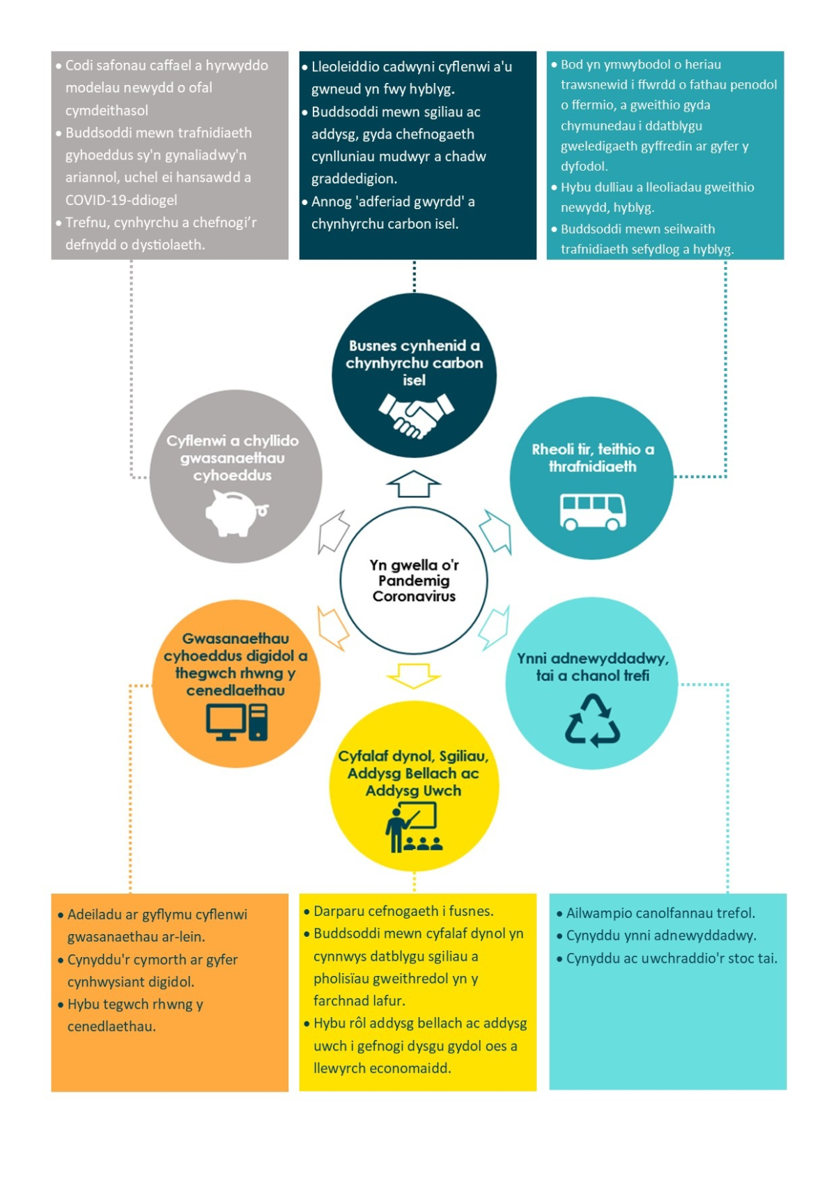 Gyda brechlynnau effeithiol ar gyfer COVID-19 bellach yn realiti, mae’r meddwl nawr yn troi at y ffyrdd gorau i ymadfer o'r ergydion economaidd a chymdeithasol tymor hirach a achoswyd gan y pandemig. Byddwn yn byw gydag adladd y pandemig am beth amser, gyda goblygiadau difrifol i'n heconomi, system addysg, iechyd a gofal cymdeithasol, a chyllid cyhoeddus.